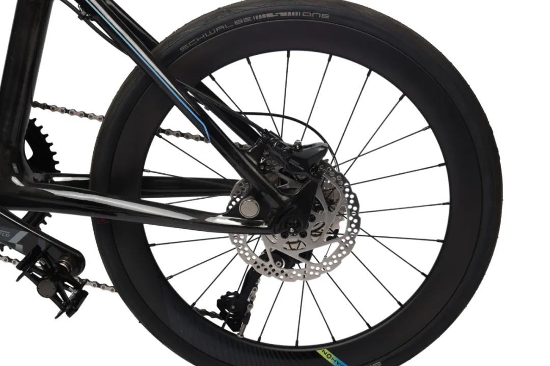 这款ODB015折叠车便是碳纤维自行车,它跟专业赛车采用同样的碳纤维作为主材料,被应用在车架、前叉、车把、车圈、曲柄、座管上,大大减轻了车身重量,轻便易行。