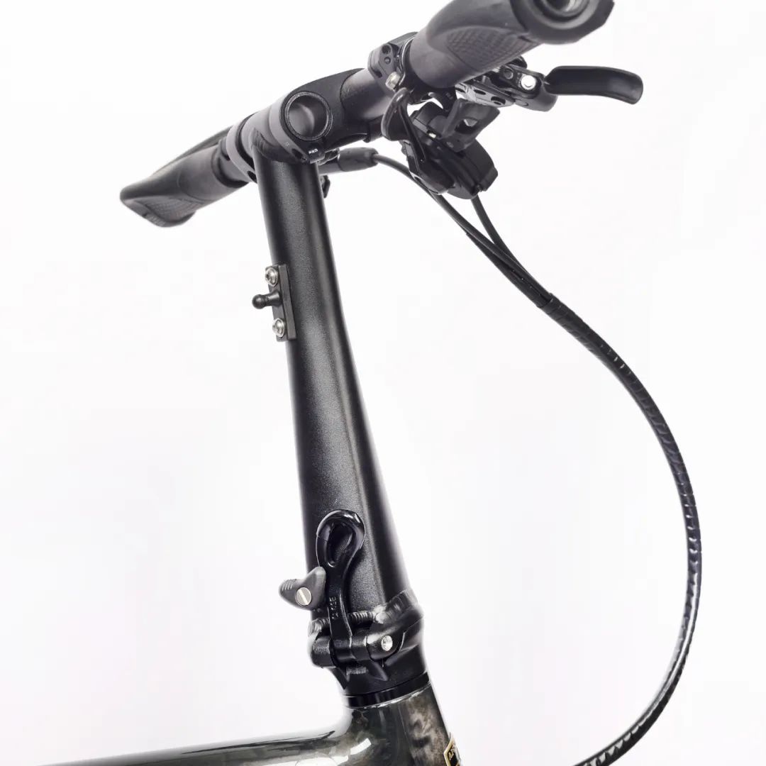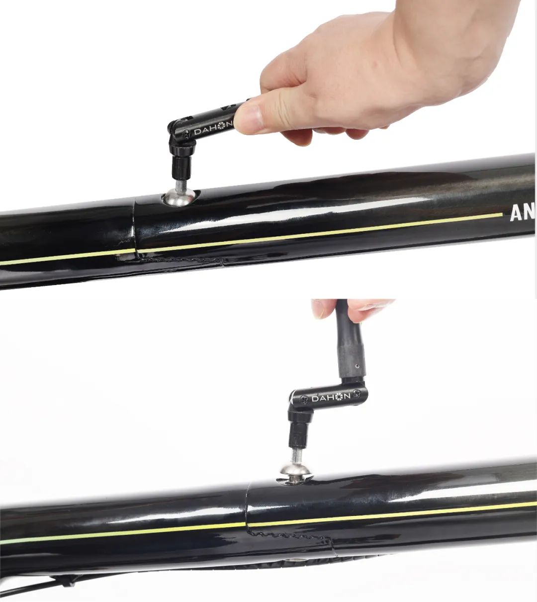 基于Lock Jaw折叠接头的铰链式折叠结构,折叠时,骑行者只需要将隐藏在车把处的“高级工具”取出便可以轻松完成折叠关节的松/紧操作,非常方便。