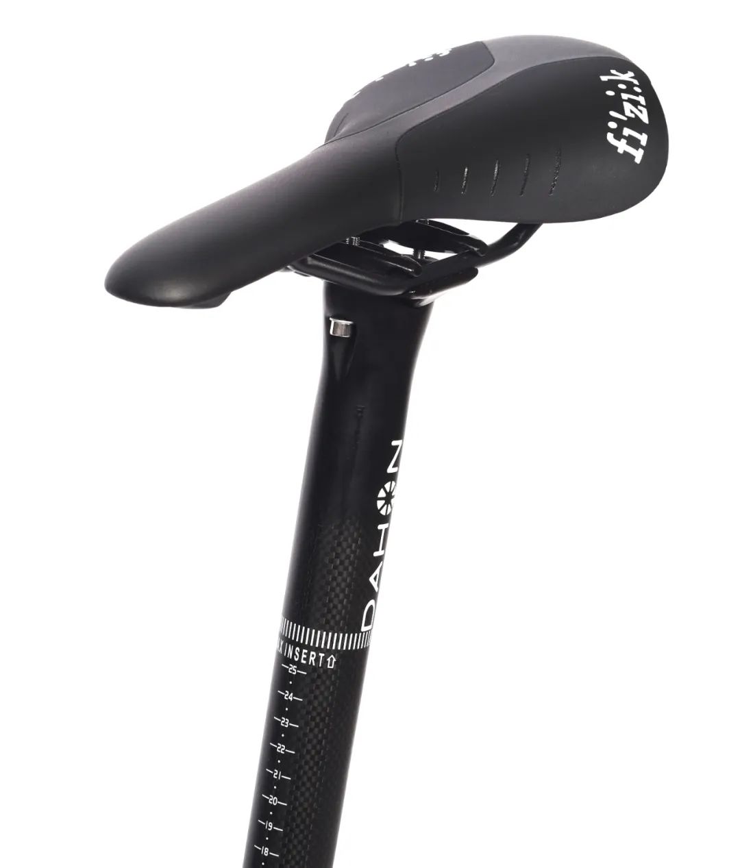 带有刻度并且设计独特的33。9*600碳纤维升降座管,好处是在你收纳与提拉座管的时候,只需要记住自己的座管高度,不用再去为座包是不是居中对准半天;