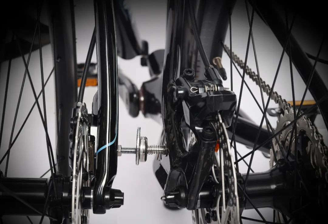 与快拆式折叠关节相比,虽然牺牲了一点折叠速度,不过提升车架刚性,也节省了折叠扣的重量。
