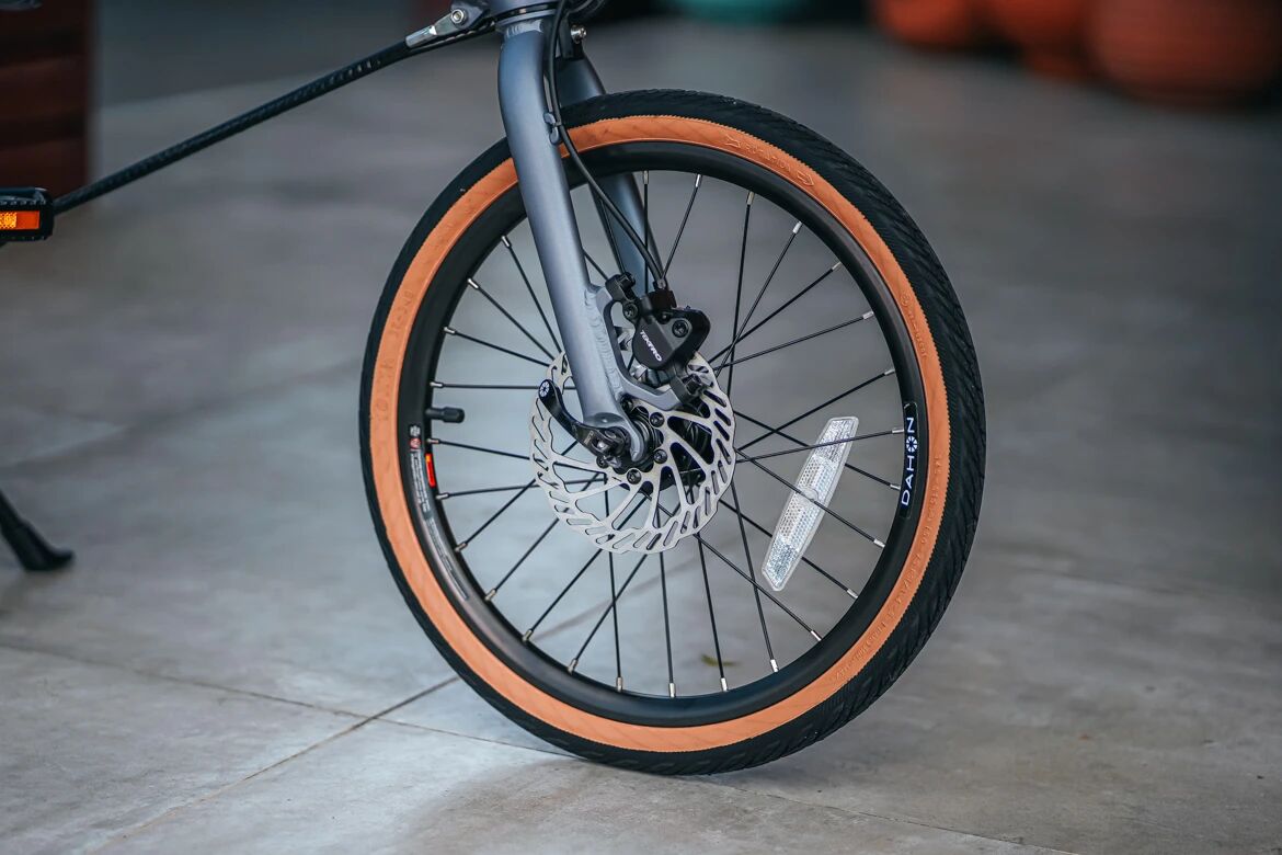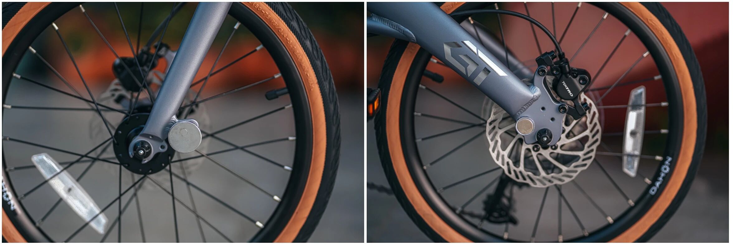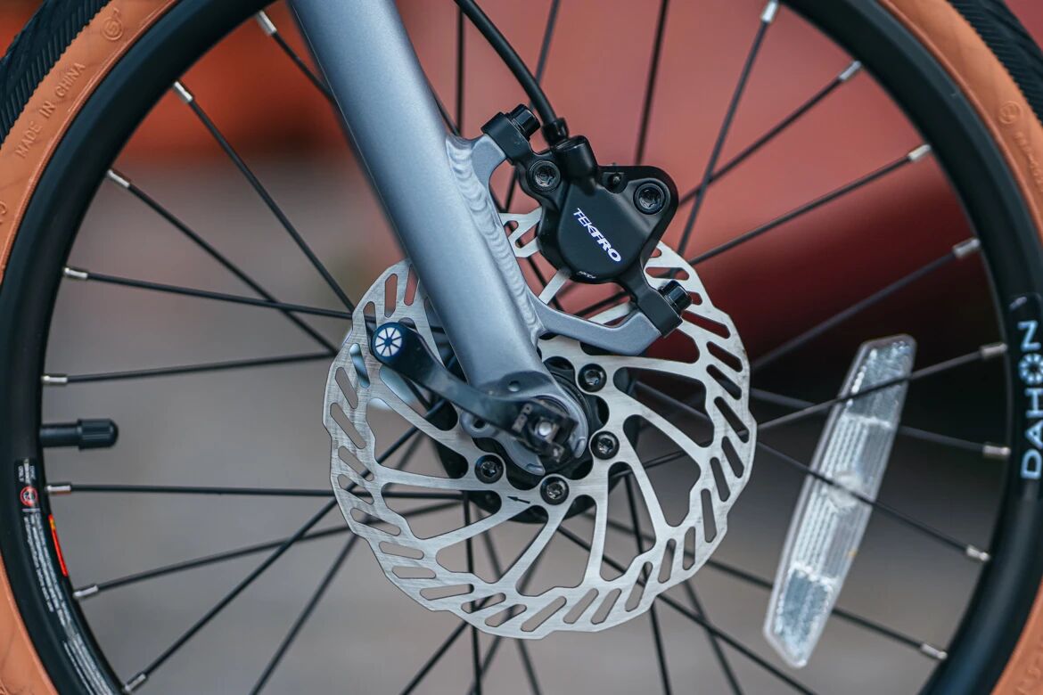 前后油压碟刹提供了稳定而敏锐的制动力,高速骑行或下坡时表现尤为突出,即使是面对雨天或洒水后的湿滑路面,刹车表现都始终可靠,安全有保障,最大程度弥补了小轮径车型制动安全性不足的问题。