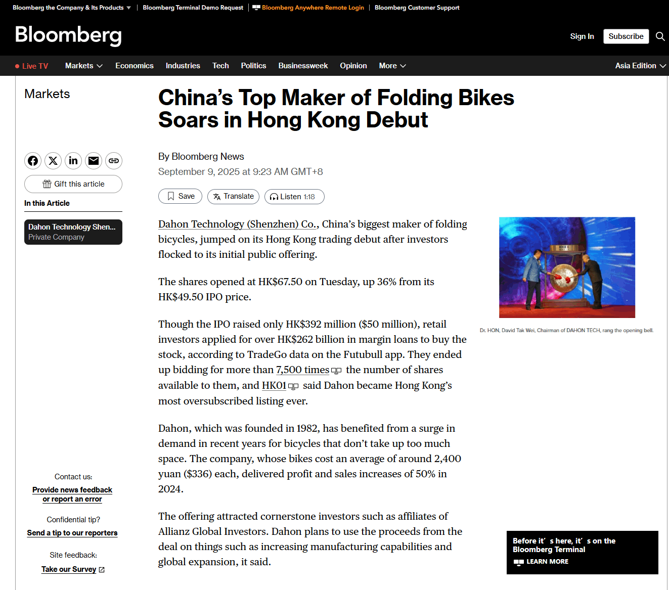 此次IPO获得了各大媒体的广泛报道。彭博社 指出,“该股开盘价为67.50港元,较IPO价格上涨36%”,凸显了投资者的浓厚兴趣。《华尔街日报》 和《巴伦周刊》也对此次上市进行了报道,强调了大行在折叠自行车市场中扮演的重要角色。