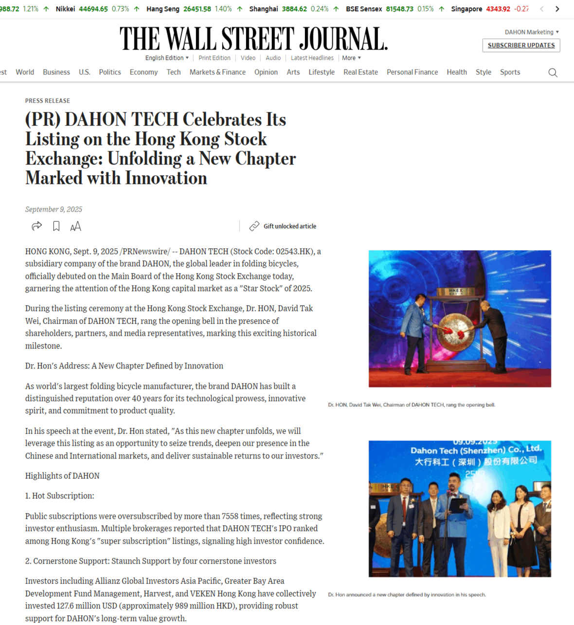 2025年9月9日,全球折叠自行车领导者大行自行车(股票代码:02543.HK)在香港证券交易所成功上市。这标志着我们发展历程中的重要里程碑,体现了我们对创新和可持续城市出行的持续承诺。