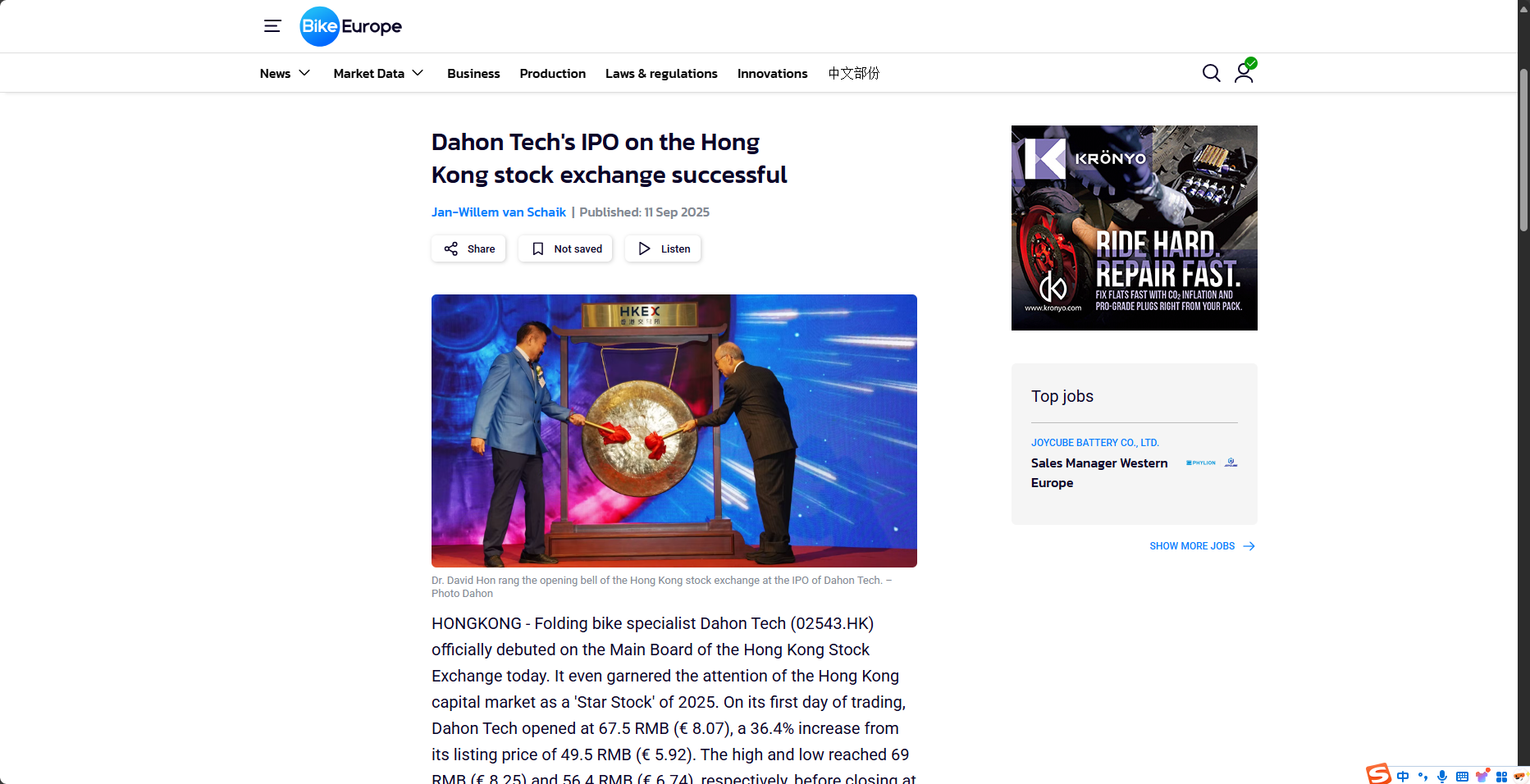 本次IPO获得了全球多家权威财经及行业媒体的高度关注与广泛报道。彭博社在报道中指出,“该股开盘报67.50港元,较发行价大幅上涨36%”,直观反映出市场与投资者的热烈反响。《华尔街日报》与《巴伦周刊》等国际主流媒体亦对本次上市事件进行了深度解读,共同聚焦于DAHON在塑造全球折叠自行车市场格局中所发挥的关键作用。