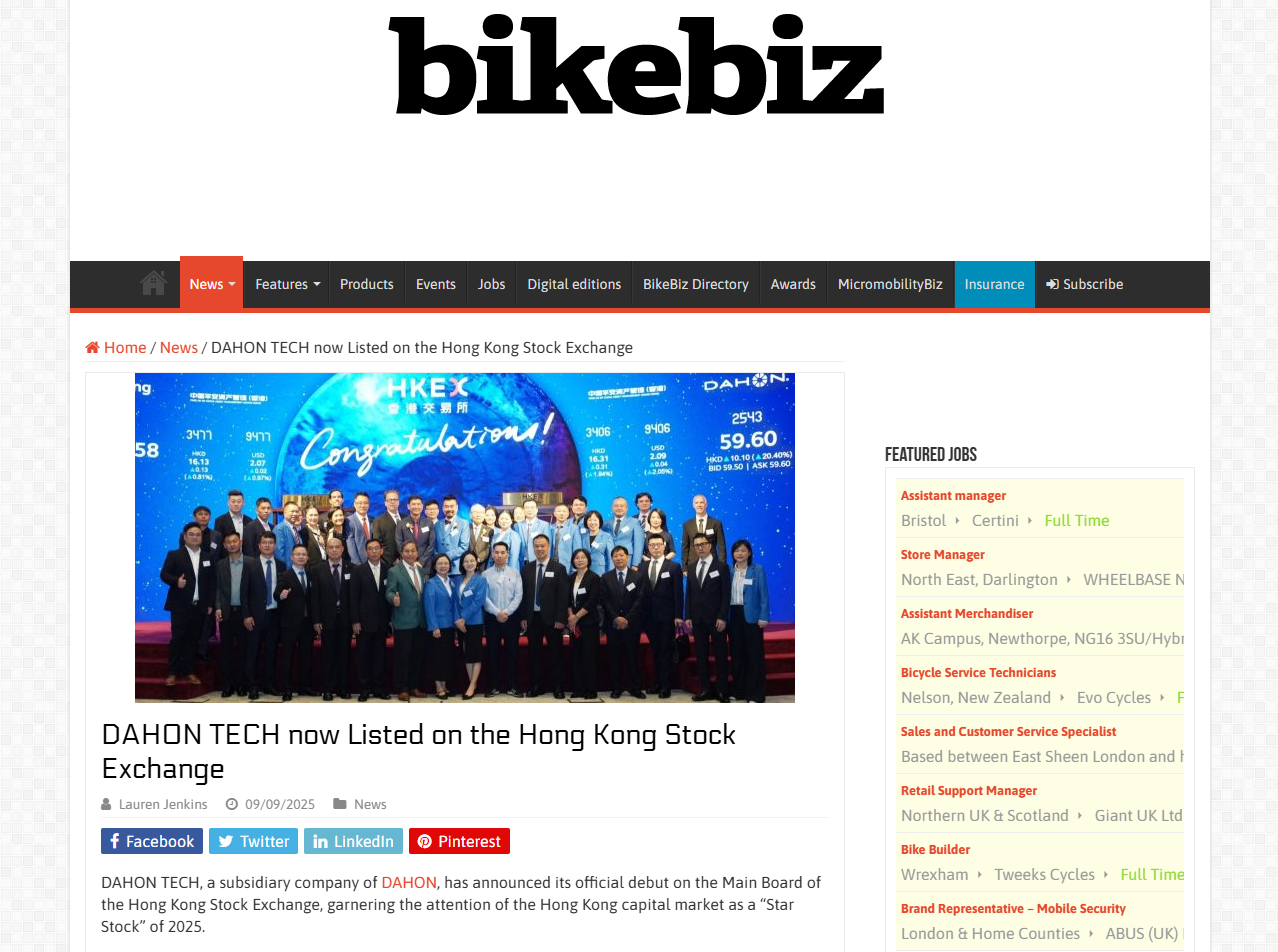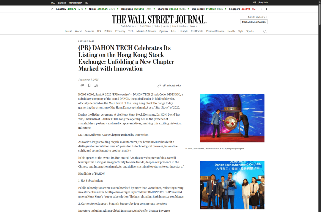 2025年9月9日,全球折叠自行车领导者——大行科工(股票代码:02543.HK)正式于香港联合交易所主板成功上市,成为公司发展历程中的一座重要里程碑。此次上市不仅彰显了我们在创新与可持续城市交通领域的持续承诺,也进一步巩固了我们在全球折叠自行车行业的领导地位。