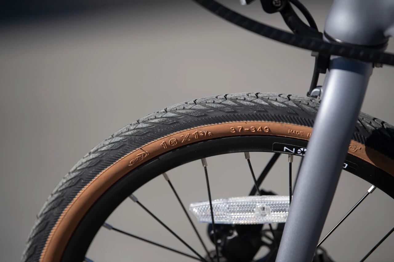 大行定制349铝合金培林轮组。可承受高气压,顺畅润滑,制动平稳舒适。较16寸直径更大,速度更快、通过性更强。可以兼容406轮组,兼顾高效骑行与便携性。