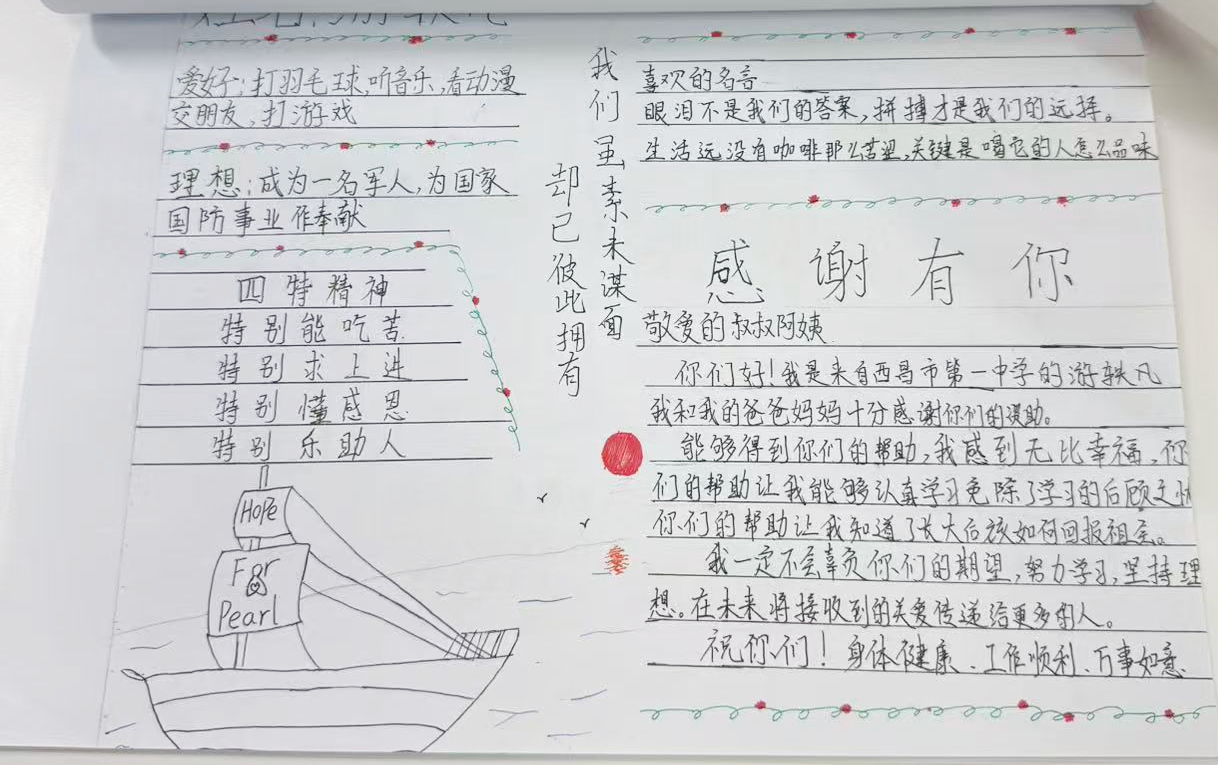 鹏城冬日,DAHON大行收到了一份特殊的包裹——四川省通江中学高2022级珍珠班合影集及西昌市第一中学珍珠生们手绘的感恩纪念册。 这是大行数年来坚持公益事业所收到的一份珍贵的礼物,亦是重新焕发光芒的珍珠生的感恩回响。感恩纪念册上一句句的真挚话语,让DAHON大行更坚定帮扶更多贫困学生的信念。