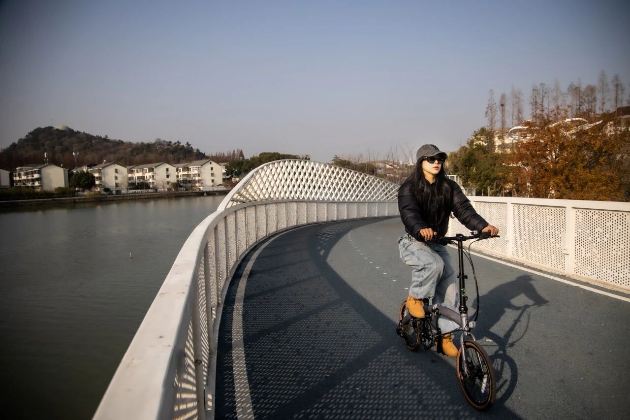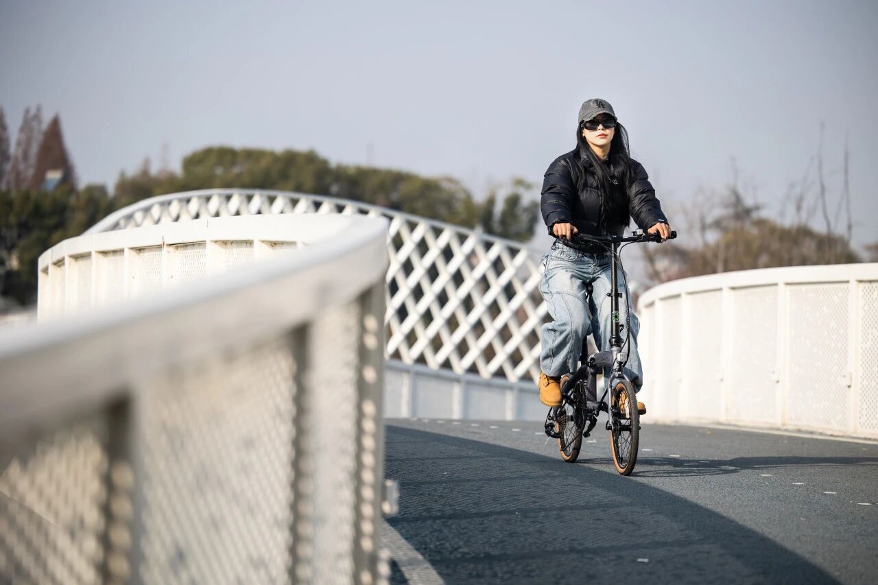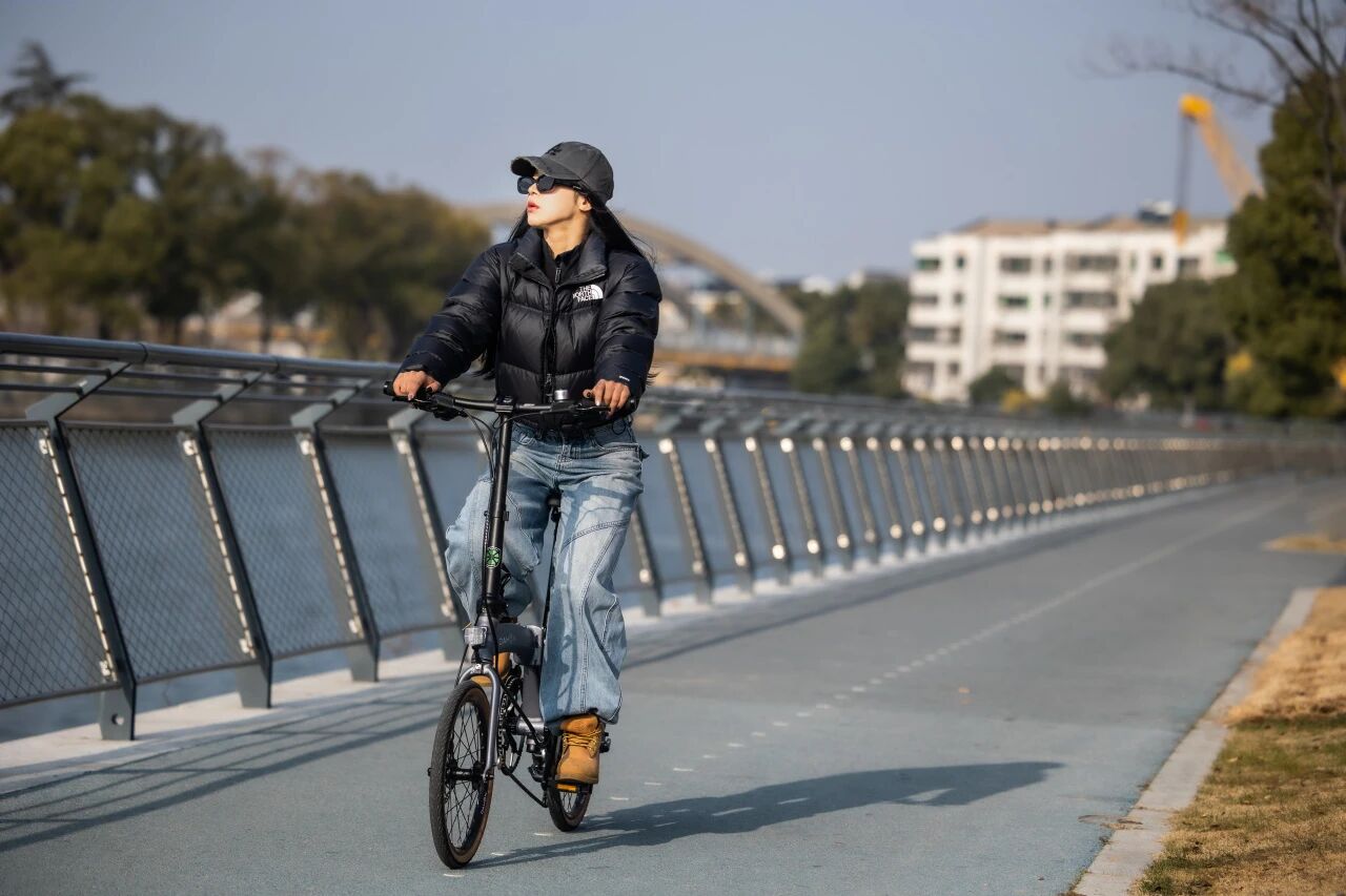 骑行体验之四,更轻更紧凑,同样采用海豚车架的MU P9没有了传统后下叉,折叠时不仅双节竖管内折速度更快,而且节省折叠空间,而且前叉碟刹前置,进一步缩短内折走线便捷性,此外,座管、竖管紧固舒环人性化设计,更适合女生操作,提升折叠效率。
