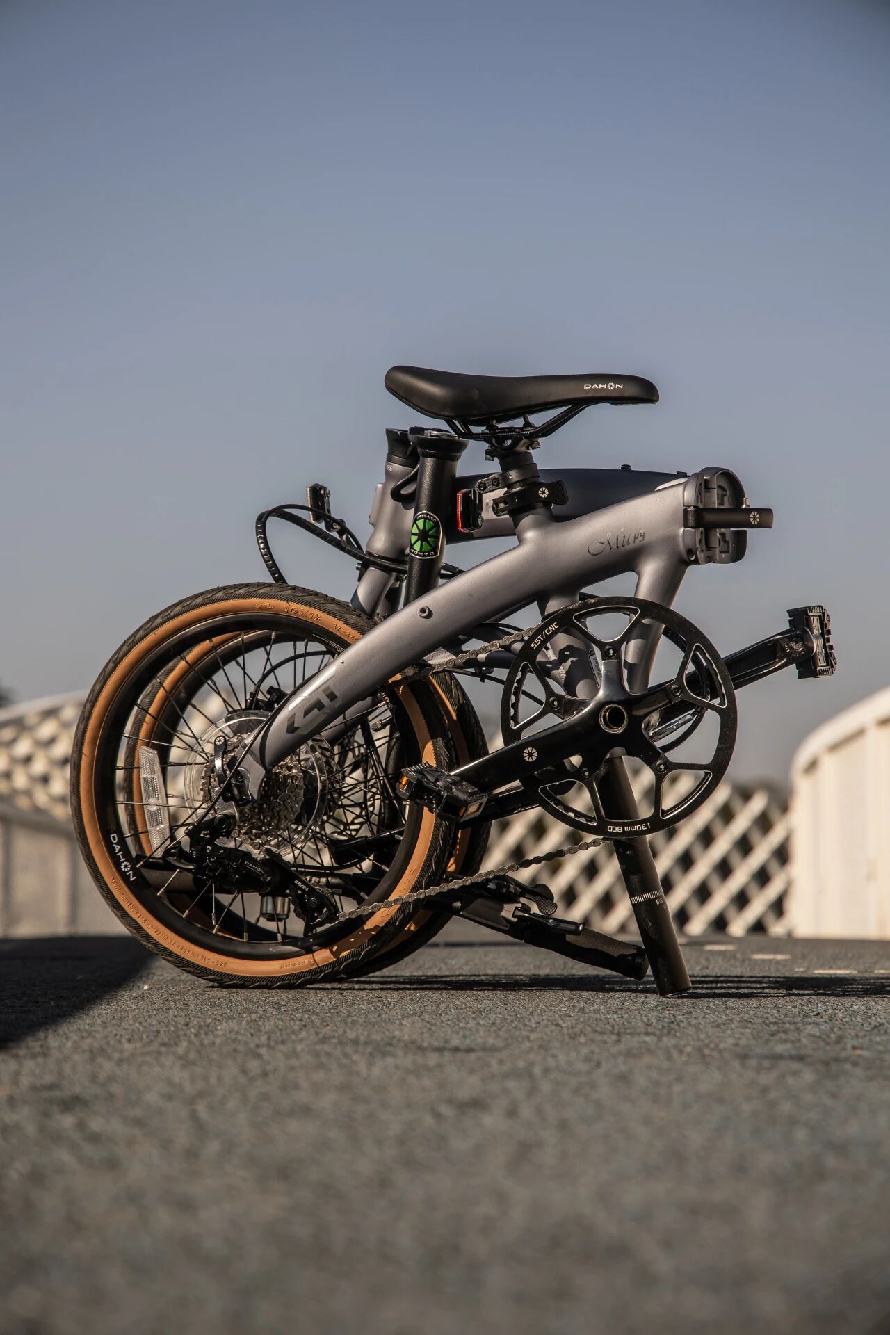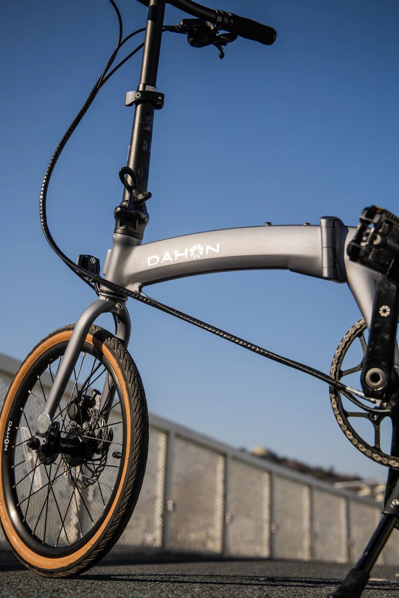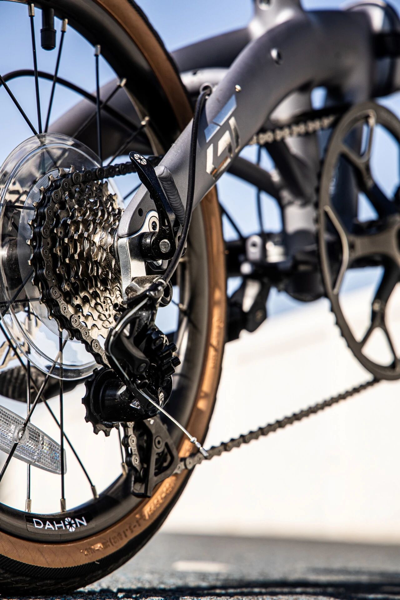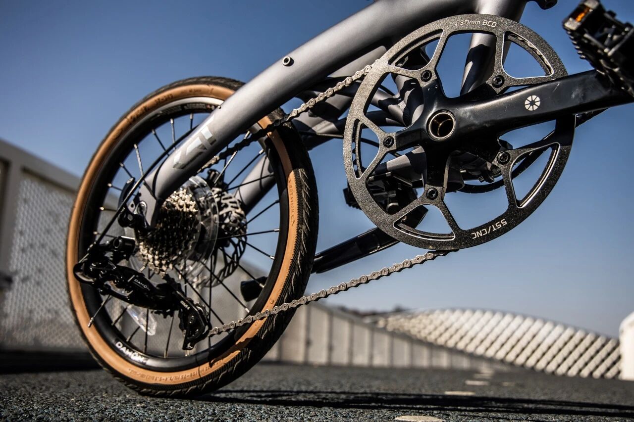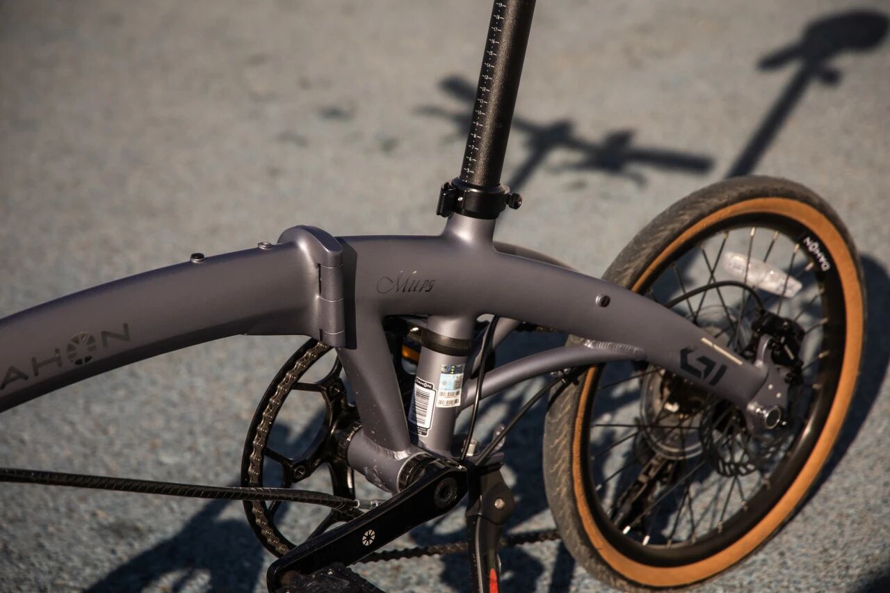 拳拳到肉的高效折叠设定,首先最大改变前叉碟刹座位置移到驱动侧,最大好处内折叠时不会碰到后碟刹座,另一大改变后上叉位置上移,同样内折叠时双节竖管不会因变速手柄位置而上下调整,侧向折叠空间更优化。