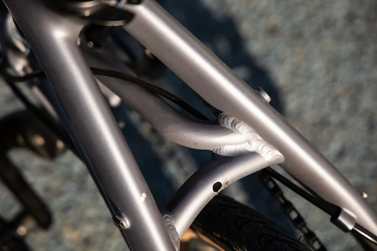MU P9的头管、后三通位置的铝合金焊接光滑无瑕,大厂工艺水平高超。