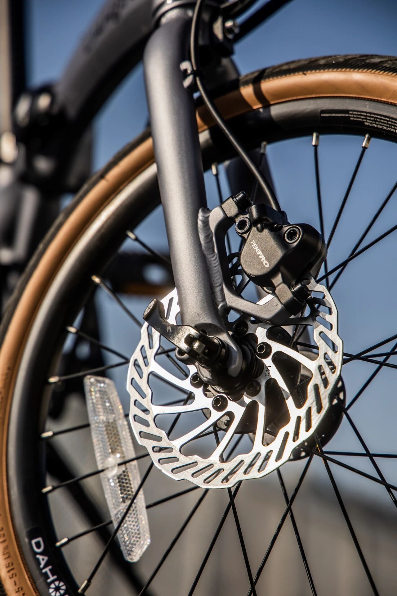 豪华配置,整车搭配Tektro油压碟刹,前后140mm碟片,在雨天等极端复杂天气中能够提供强劲的制动力。