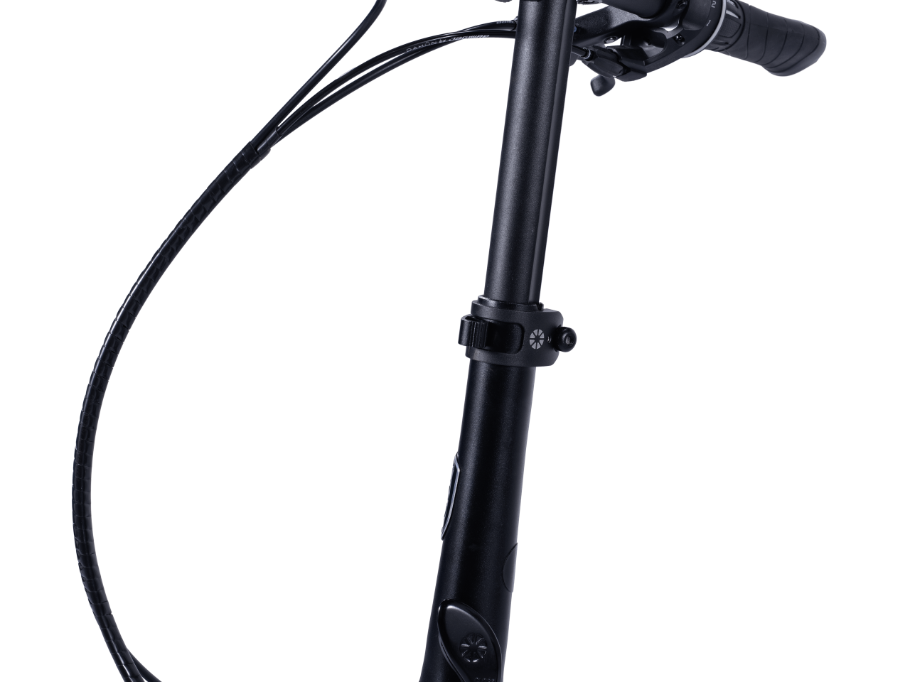 立管呈方锥形,比圆管更粗壮;一体锻造无焊接,坚固耐用;束环特别加宽镂空,既减小手柄凸出,同时增加竖管接触面,上下双重锁紧,毫不松动。这些优化设计,全面增加整支竖管刚度,泄力更小,保障骑乘安全。内V锁紧机构更简化,减轻重量;全新设计安全钩,自动扣紧,操作轻松。