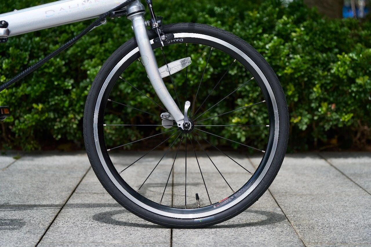 采用一对1 1 3/8的半光头胎,采用中间浅、两边深的纹路设计,既兼顾平路高速骑行,又能兼容碎石等复杂城郊路况,胎肩能够提供强有力的侧向支撑,此外,整条胎也很耐磨。