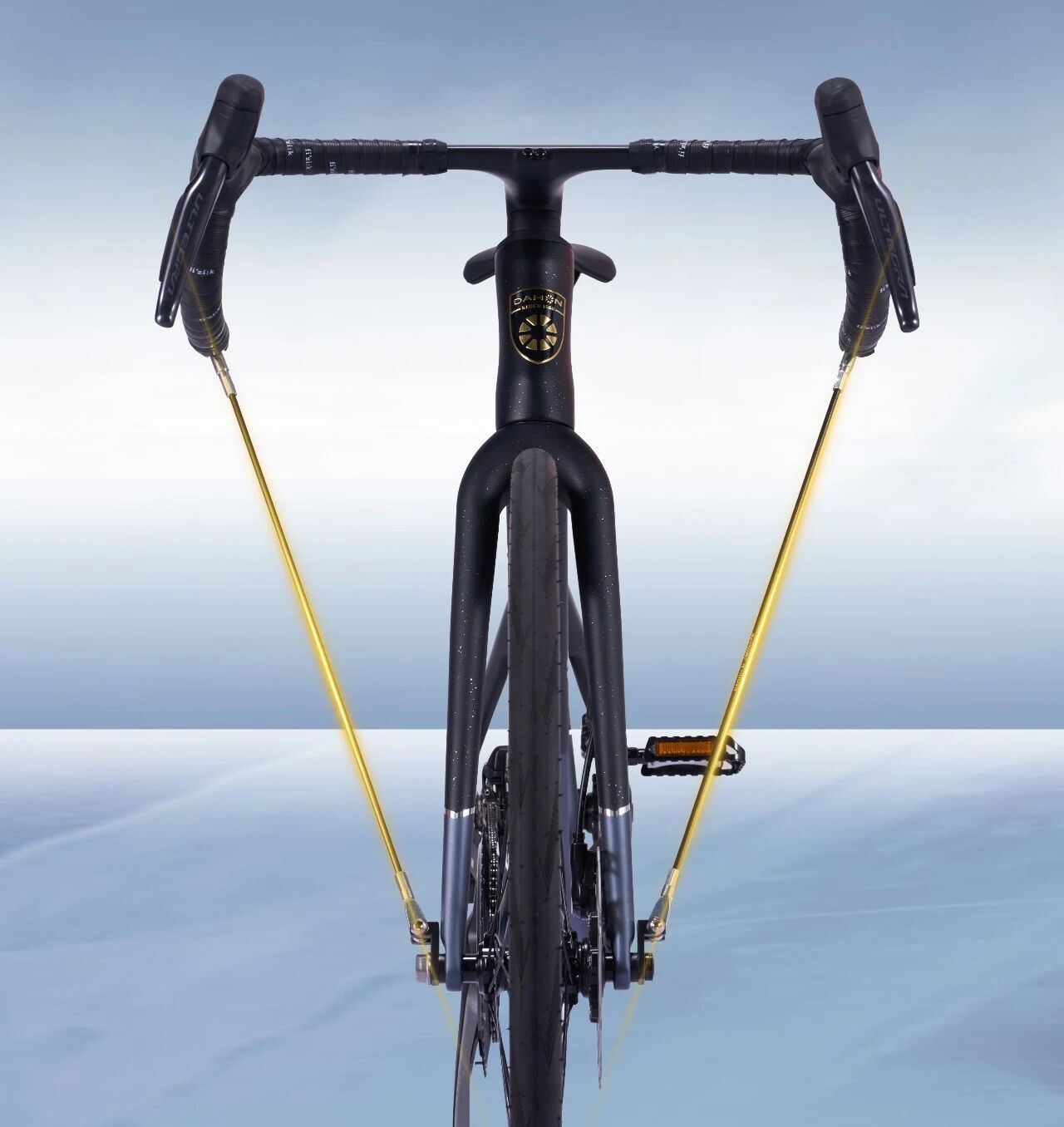 DELTECH PLUS鲨鱼线的加入,显著提升了整车框架从把手、把立到前叉的刚性,通过形成独特的三角结构,减少因变形导致的能量损失,从而实现更直接的踩踏力传递和更精准的控制。用户将体验到前所未有的动力支撑和稳定骑行,轻松应对冲刺、攀爬和高速转弯。